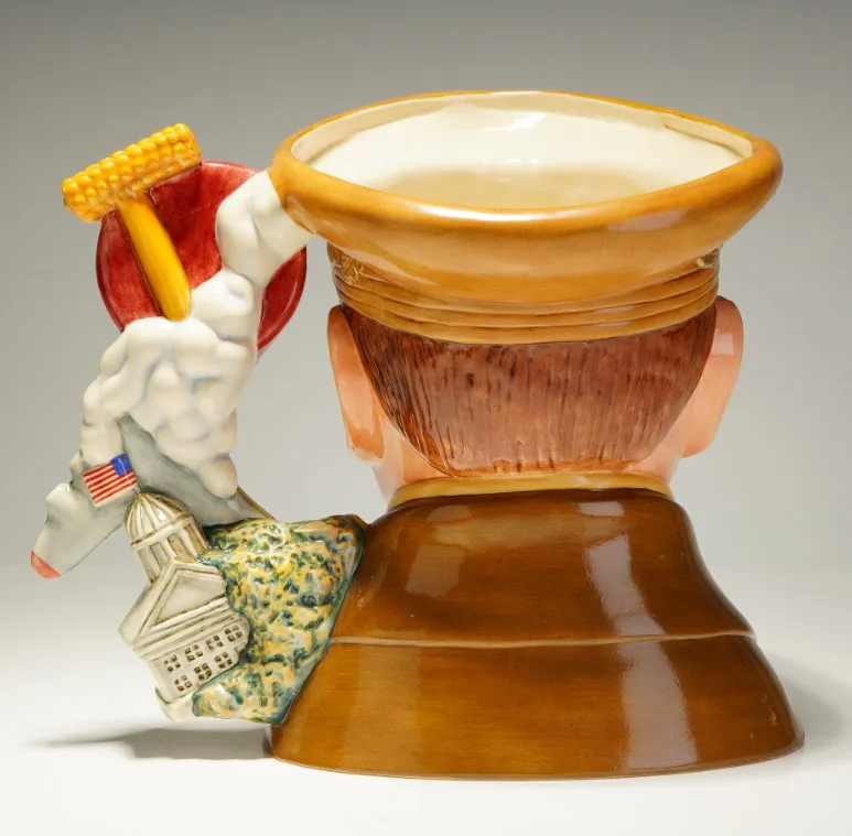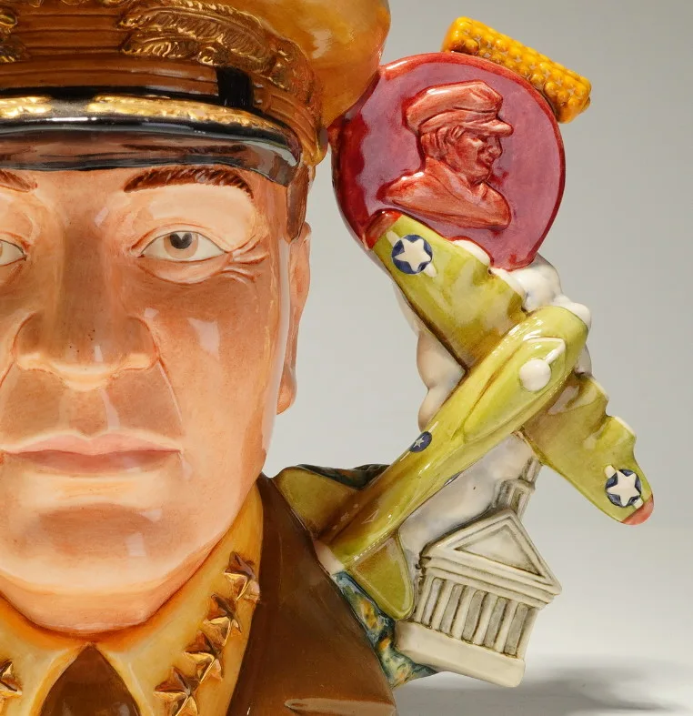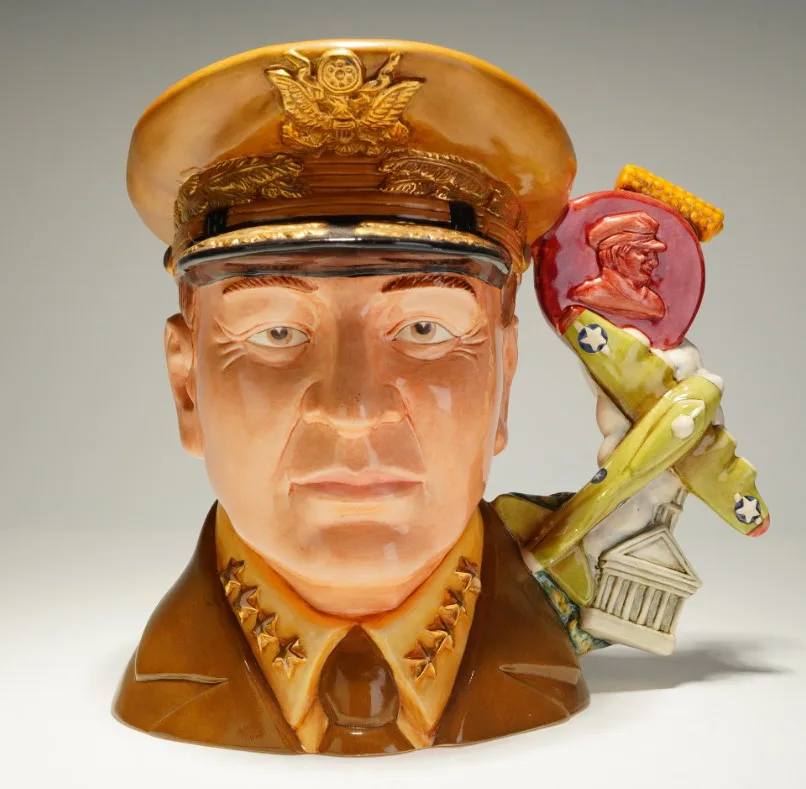 The jug depicts General Douglas MacArthur (1880–1964), one of the most prominent American military leaders of the twentieth century. MacArthur served as a five-star general and played a major role in the Pacific theatre during the Second World War, later overseeing the Allied occupation of Japan. His iconic status and distinctive appearance have made him a popular subject for commemorative ceramics and character jugs.